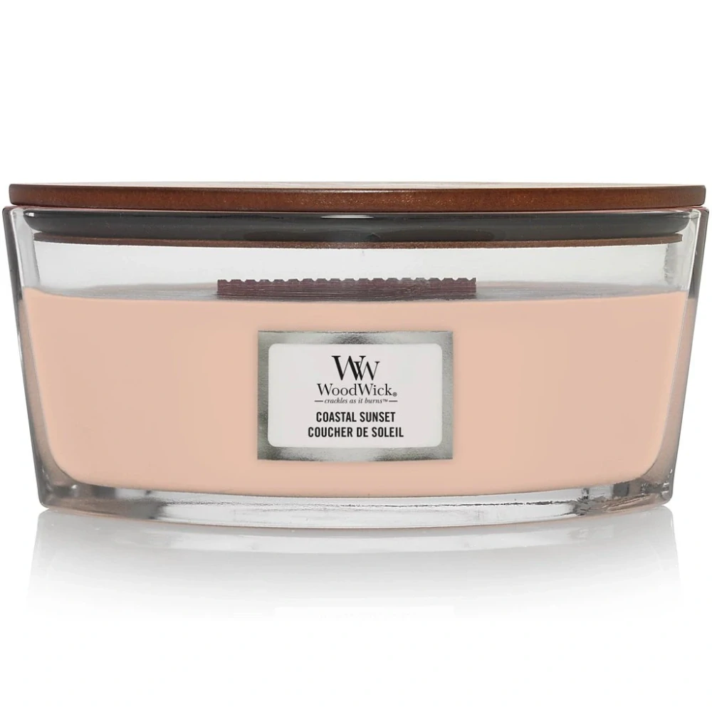 Svíčka WoodWick Coastal Sunset v provedení loďka s růžovým voskem a praskajícím dřevěným knotem přináší vůni květů, kokosu a mořského vánku.